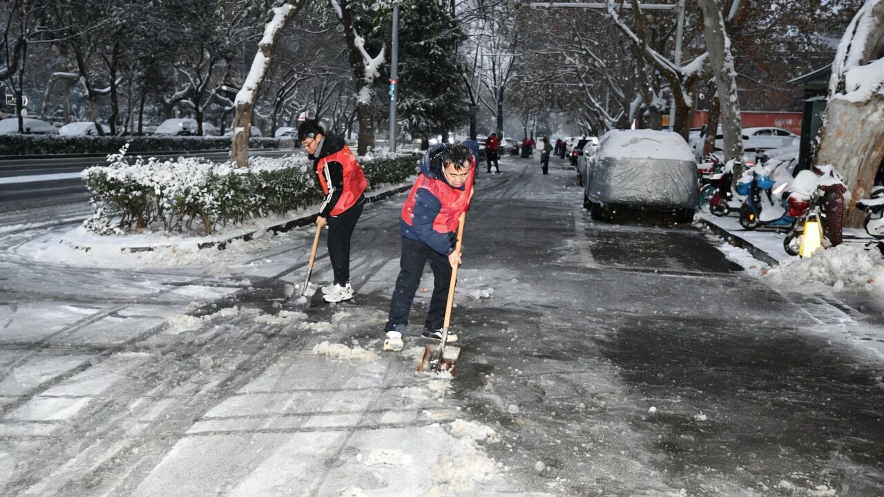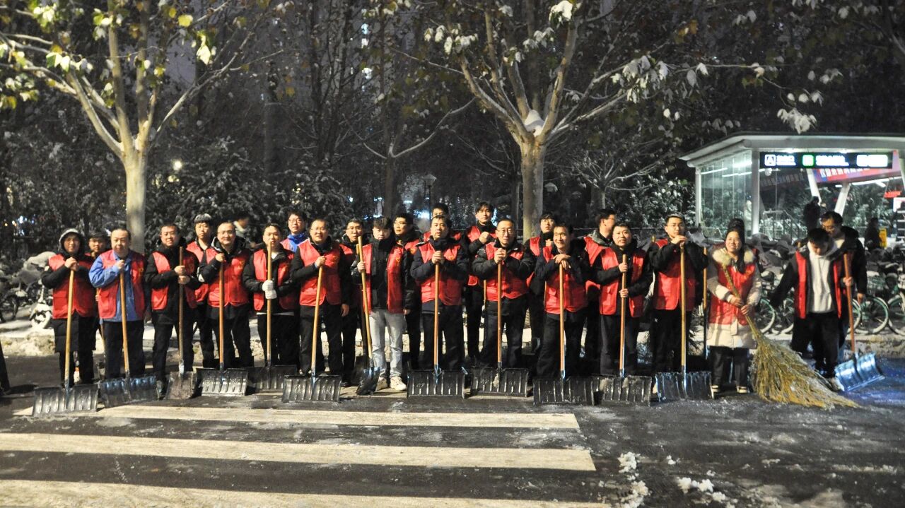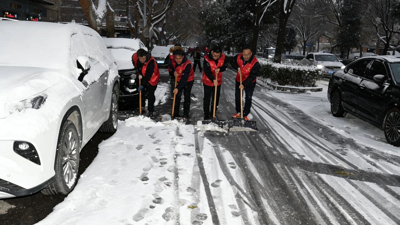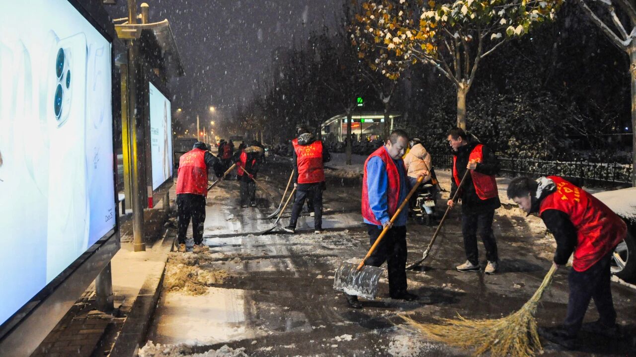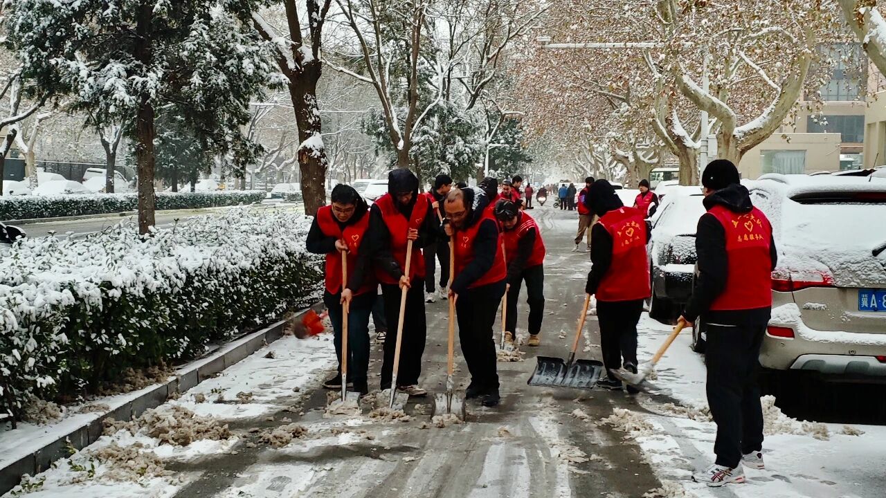 寒风凛冽,雪落无声,行动铿锵。志愿者们手持扫帚、铁锹,迎风战雪、干劲昂扬。有人俯身清扫积雪,有人全力铲除冻冰,一个个忙碌的身影在白雪覆盖的道路上勾勒出团结协作、奋勇争先的生动画面。大家分工明确、配合默契,对路面冰雪进行清除,有效改善路面通行条件,为过往行人增添了一份安心与暖意。