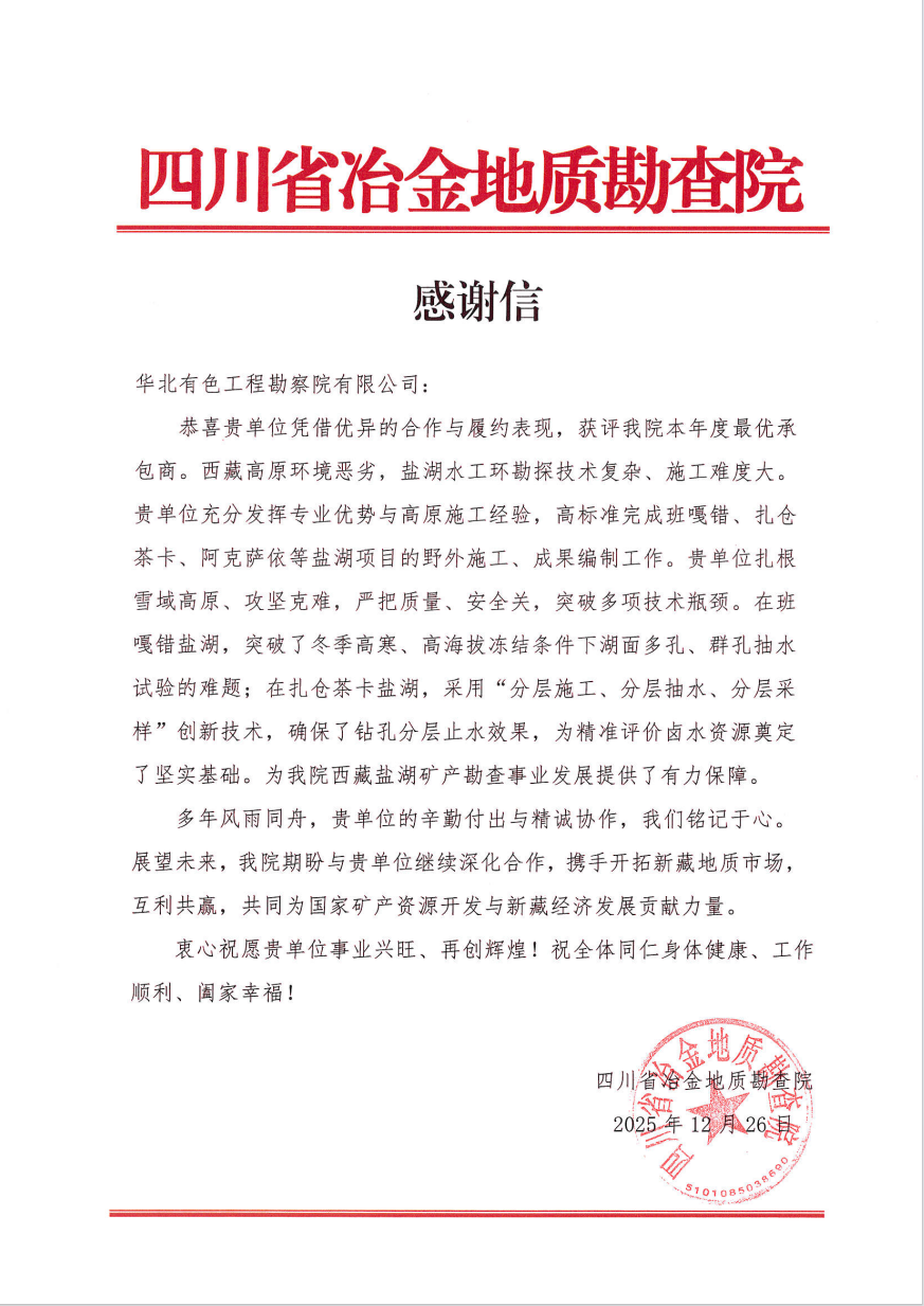 近日,四川省冶金地质勘查院向我院发来感谢信,祝贺我院获评其“本年度最优承包商”。信中指出,在西藏盐湖水工环勘探项目中,面对极端环境与复杂技术挑战,我院团队充分发挥专业优势与高原经验,攻克多项技术难关,高质量完成班嘎错、扎仓茶卡等盐湖项目的勘探任务,为西藏盐湖资源勘查事业提供了有力支撑。