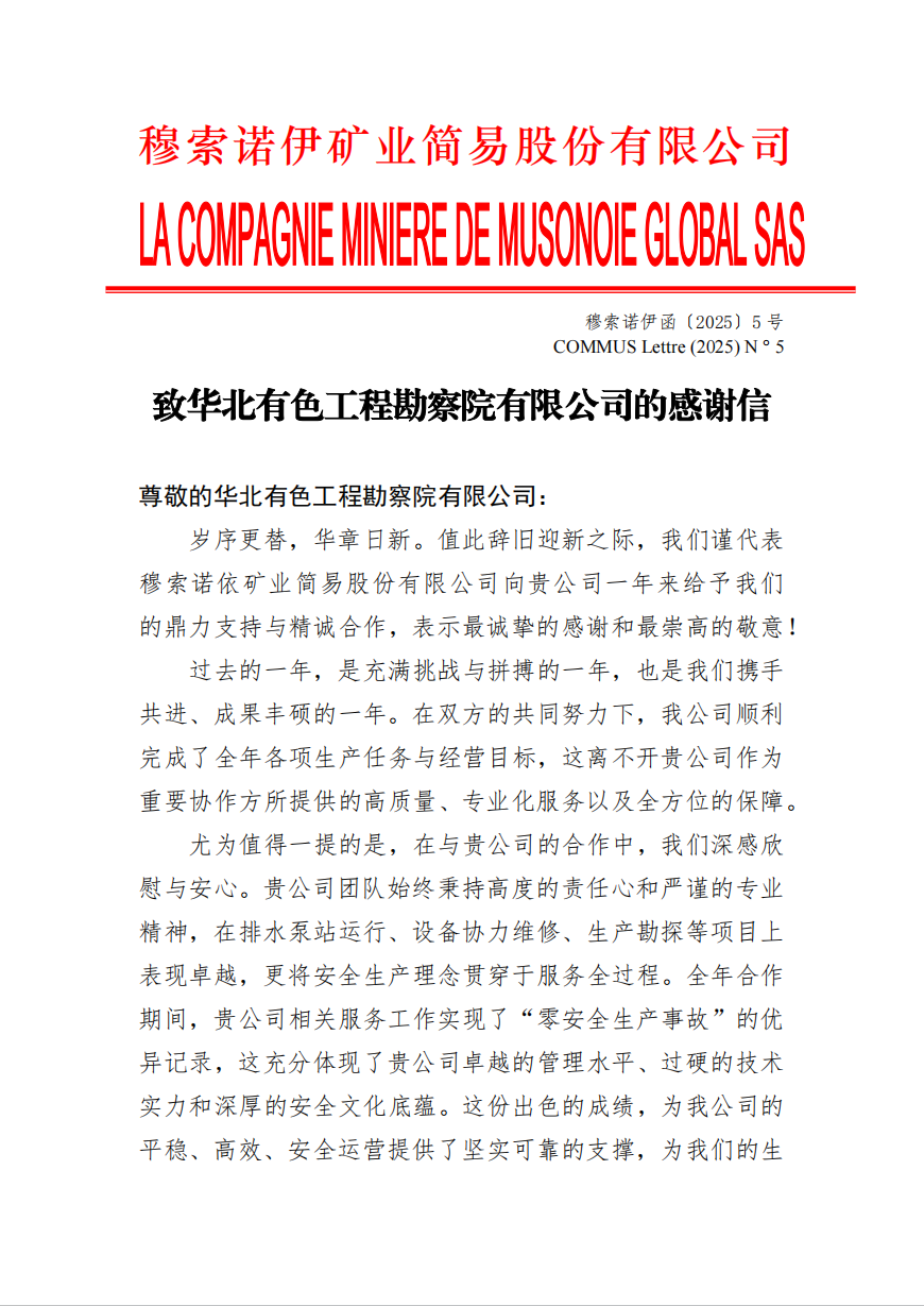 同期,我院收到来自刚果(金)穆索诺伊矿业简易股份有限公司的感谢信。信中强调,在过去一年的协作中,我院在排水泵站运行、设备协力维修、生产勘探等方面表现优异,更以全年“零安全生产事故”的卓越纪录,为合作方筑牢安全生产防线,充分体现了我院面对海外复杂环境,展现出的高度责任心、严谨的专业精神和卓越的执行力。