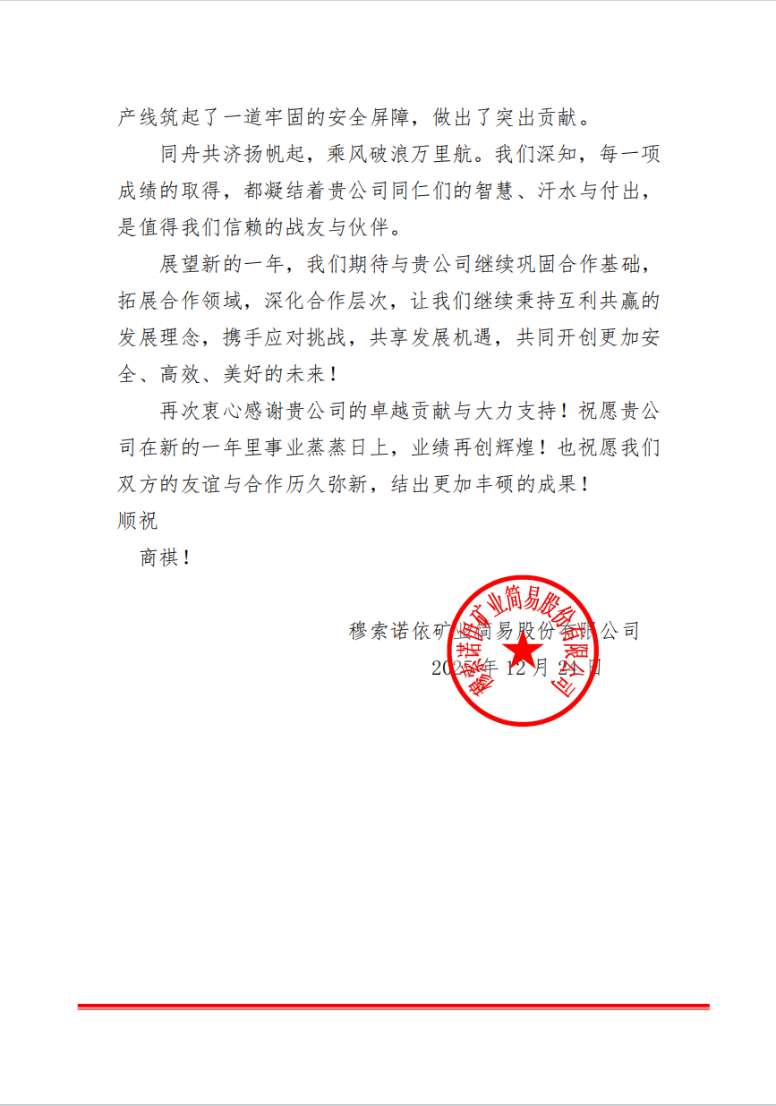 在新年将至,华勘院在岁末接连收获来自合作伙伴的感谢信函。信中的真挚话语,承载着对我院专业技术与卓越服务的认可,也见证着彼此在高海拔极地、海外矿区与“一带一路”重大项目中携手攻坚的深厚情谊。这份跨越山海、饱含温度的肯定,为华勘院的2025年画上了温暖而有力的句点。