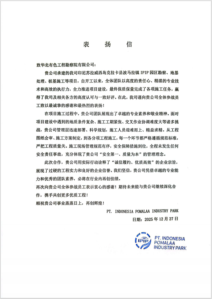 近日,华勘院亦收到来自印尼PT.INDONESIA POMALAA INDUSTRY PARK(华友集团IPIP工业园区)的表扬信。信中对华勘院承建的印尼苏拉威西岛IPIP园区勘察、地基处理及桩基施工等项目给予高度评价。面对复杂地质条件、紧张工期与多重交叉作业挑战,项目团队科学组织、精准施工,凭借先进的工艺技术和高效的项目执行力,保质保量完成了各项任务,展现了华勘院在海外复杂工程环境下的专业实力与协作精神。